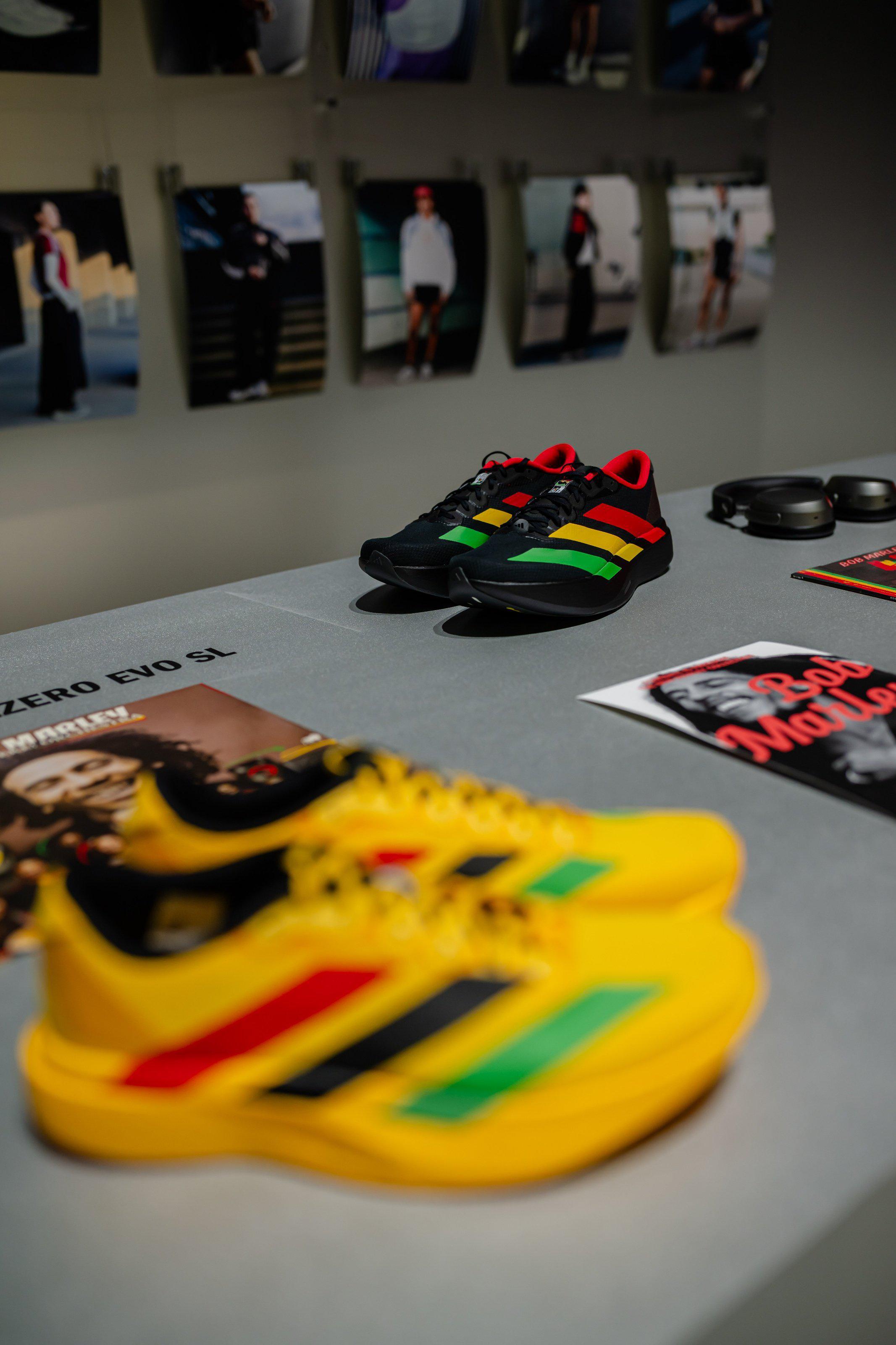 活动现场展出的ADIZERO的多款联名系列,图为与牙买加雷鬼音乐传奇人物Bob Marley的联名款