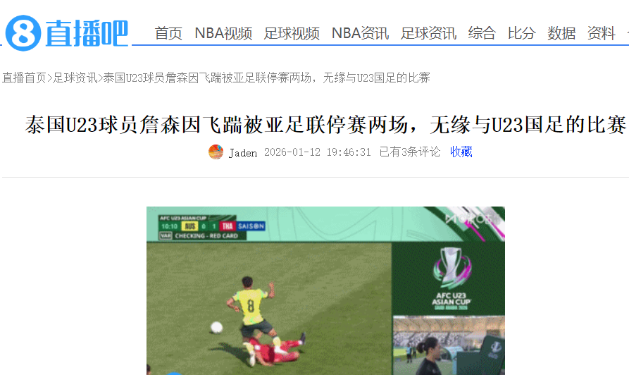 赛前,中国队迎来了两个好消息,第一是亚足联今日官方公布了一则罚单,就是泰国队球员冯艾克-詹森因在小组赛首轮与澳大利亚队的比赛中飞踹对手小腿被红牌罚下,最终被处以禁赛两场的处罚,意味着缺席与中国队的比赛。